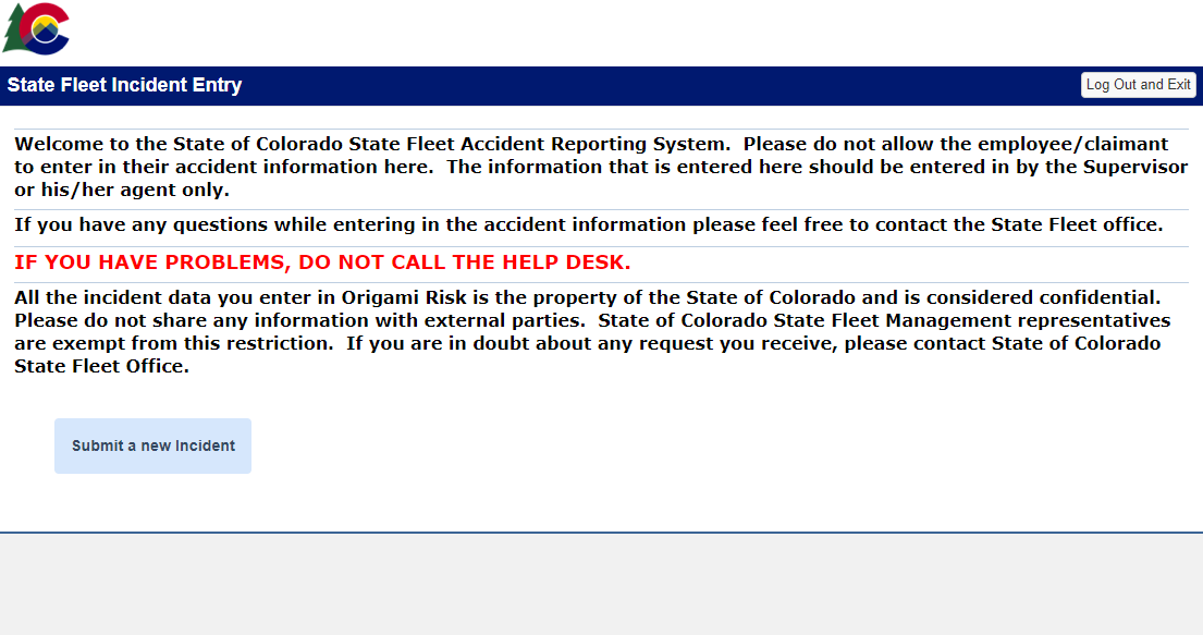 *This link should direct you to the State Fleet Incident Entry page where you will start the form by clicking the button "Submit a new Incident". (Image below)